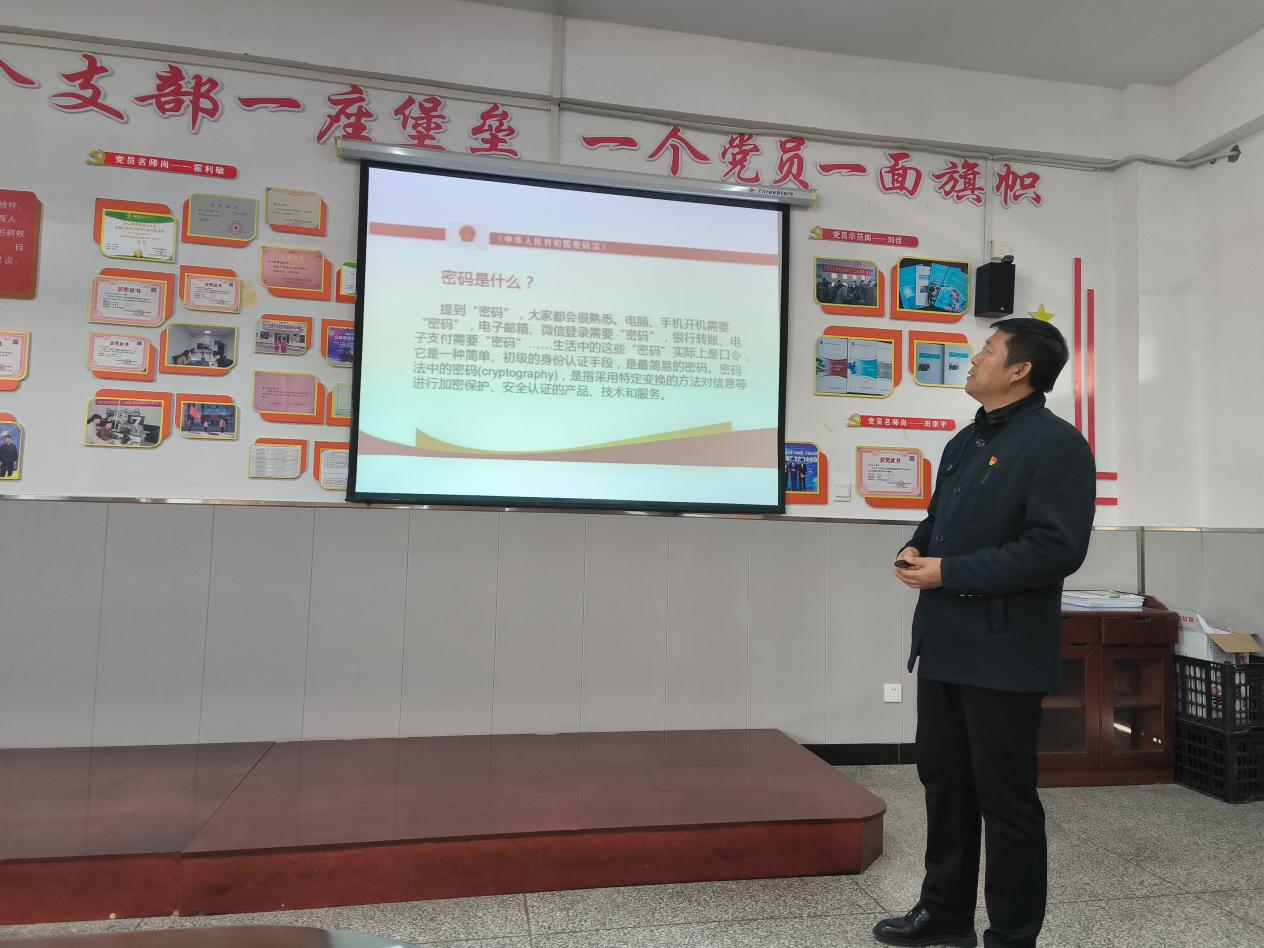 本次主題黨日活動組織全體黨員觀看了《百姓身邊的密碼》視頻,黨支部副書記王建斌同志從國家安全角度出發(fā),以《密碼法知識》為主題從密碼工作的創(chuàng)建、密碼是什么、密碼的功能、密碼的類別、密碼法的立法目的和內(nèi)容等方面展開講解,引導(dǎo)黨員教師全面了解密碼法,深刻領(lǐng)會了密碼在維護國家安全、促進經(jīng)濟社會發(fā)展、保障人民群眾利益中的重要作用。