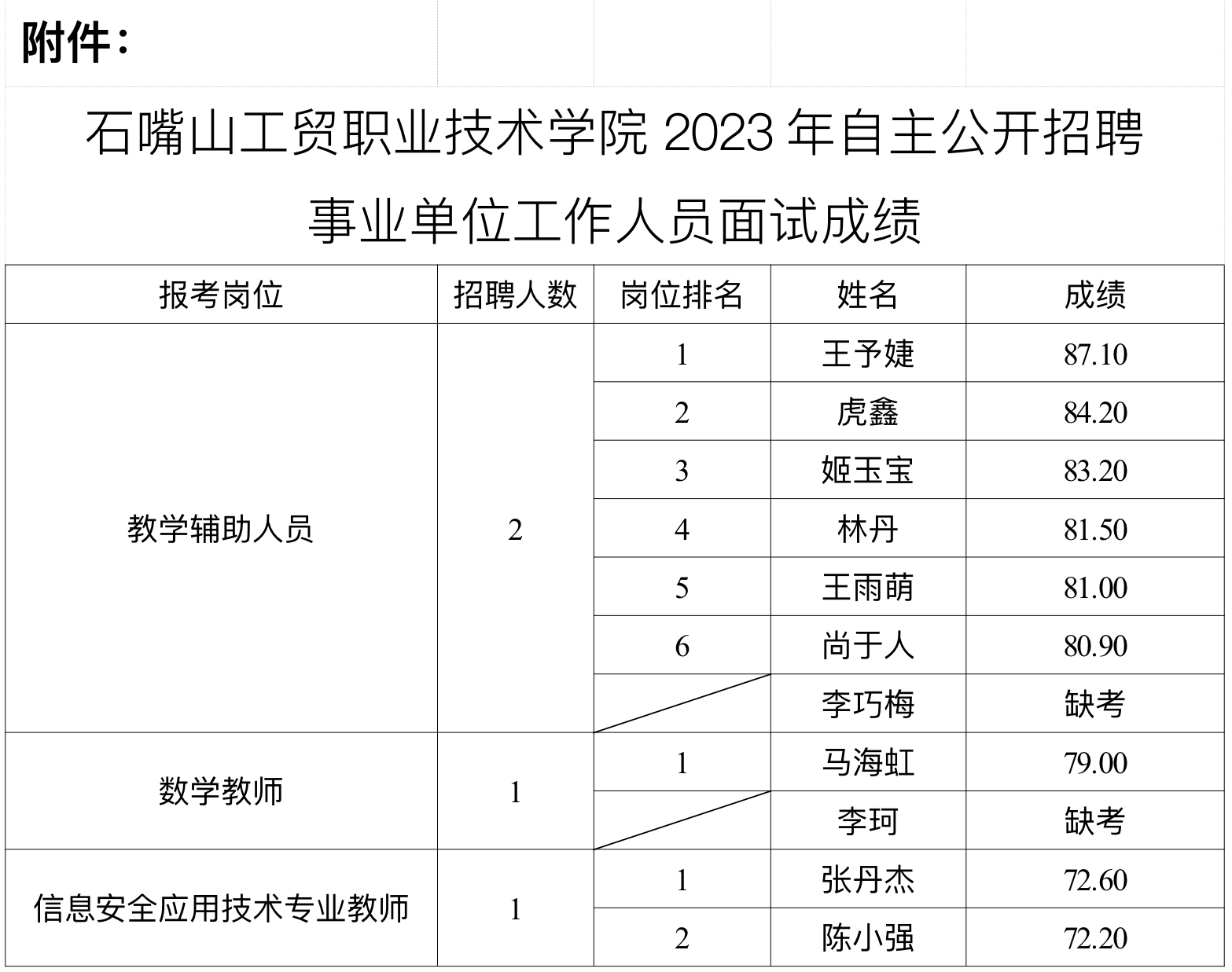 現(xiàn)將石嘴山工貿(mào)職業(yè)技術(shù)學(xué)院2023年自主公開招聘事業(yè)單位工作人員面試成績(jī)公告如下。?