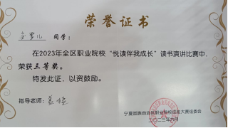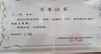 6月16日,在全區(qū)職業(yè)院校組織的“悅讀伴我成長”讀書演講比賽中,學(xué)院選送的高職學(xué)生金雪兒和中職學(xué)生馬梅均獲得全區(qū)三等獎(jiǎng)的佳績。
