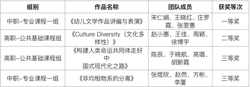 本次比賽成績較往年穩(wěn)中有進(jìn),獲獎團(tuán)隊(duì)涉及幼兒保育、化學(xué)工藝2個專業(yè)課程和英語、思想道德與法治2個公共基礎(chǔ)課程。在人員構(gòu)成上,涉及青年教師、骨干教師、雙師型教師以及專業(yè)團(tuán)隊(duì)帶頭人,通過以老帶新的形式,助力青年教師教學(xué)能力再上新臺階。