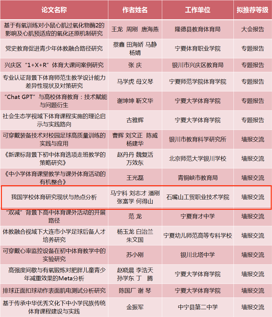 為貫徹落實(shí)習(xí)近平總書(shū)記關(guān)于體育強(qiáng)國(guó)建設(shè)的重要指示和全國(guó)教育大會(huì)精神及全國(guó)職業(yè)教育大會(huì)指示精神,學(xué)院高度重視體教融合工作??蒲刑幐鶕?jù)《自治區(qū)教育廳辦公室關(guān)于征集中華人民共和國(guó)第一屆學(xué)生(青年)運(yùn)動(dòng)會(huì)科學(xué)論文報(bào)告會(huì)論文》的通知要求,在學(xué)院進(jìn)行廣泛宣傳,經(jīng)過(guò)學(xué)術(shù)委員會(huì)的層層審核,最終推選馬寧科、劉志才等教師撰寫(xiě)的《我國(guó)學(xué)校體育研究現(xiàn)狀與熱點(diǎn)分析》論文進(jìn)行報(bào)送。
