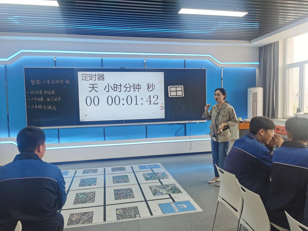 機電一體化教師黃舒婷講授了《智能小車自動行駛設(shè)計》,通過“探、設(shè)、編、調(diào)、評”五步教學步驟,運用任務(wù)驅(qū)動、合作探究等教學方法,讓學生根據(jù)沙盤設(shè)計小車自動行駛的軌跡路線,根據(jù)功能模塊的特點進行器件選型與組裝,完成小車自動行駛的程序設(shè)計,在應(yīng)用場景下完成小車綜合系統(tǒng)調(diào)試,通過項目展示匯報,鍛煉學生團隊協(xié)作能力、強化精益求精的工匠思維。