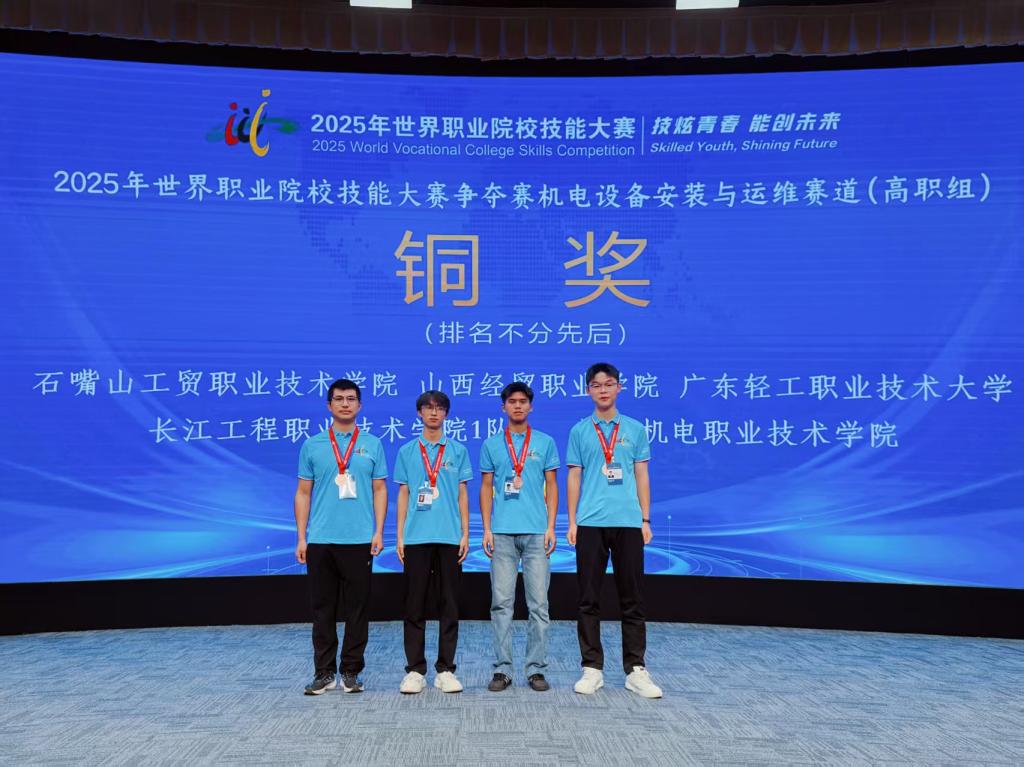 2025年9月22日,世界職業(yè)院校技能大賽爭奪賽機電設(shè)備安裝與運維賽道在天津機電職業(yè)技術(shù)學(xué)院圓滿落幕。經(jīng)過4天的激烈角逐,電氣工程系侯穩(wěn)展、馬文、吳曉兵、楊德榮軒4名同學(xué)組成的參賽隊伍,憑借扎實的專業(yè)技能、默契的團(tuán)隊協(xié)作與穩(wěn)定的臨場發(fā)揮,從全國90支參賽隊伍中脫穎而出,斬獲團(tuán)體賽銅牌(三等獎),這也是石嘴山工貿(mào)職業(yè)技術(shù)學(xué)院首次在該賽道上獲得國家級榮譽。