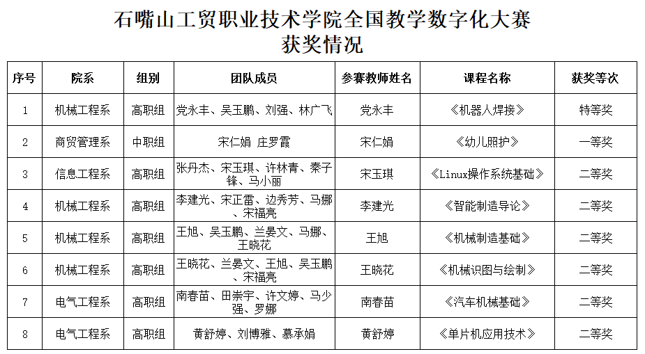 學院選送的《幼兒照護》《Linux操作系統基礎》《智能制造導論》《機器人焊接》等8個團隊在大賽中分別獲得特等獎、一等獎、二等獎的好成績,學院榮獲“優(yōu)秀組織獎”。