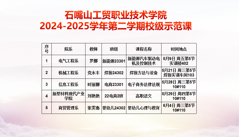 為進(jìn)一步提升學(xué)院教師教學(xué)效果和教學(xué)能力,發(fā)揮示范課作為提高教師教學(xué)水平和質(zhì)量的常態(tài)化制度作用,不斷推進(jìn)學(xué)院課堂教學(xué)方法和課程評價(jià)改革,學(xué)院于6月組織開展完成2024-2025學(xué)年第二學(xué)期校級示范展示活動(dòng)。經(jīng)各院系精心組織選拔,本學(xué)期共有5位教師進(jìn)行校級示范課展示,并采取線上線下同步直播形式面向全校教師開展示范課聽評課。