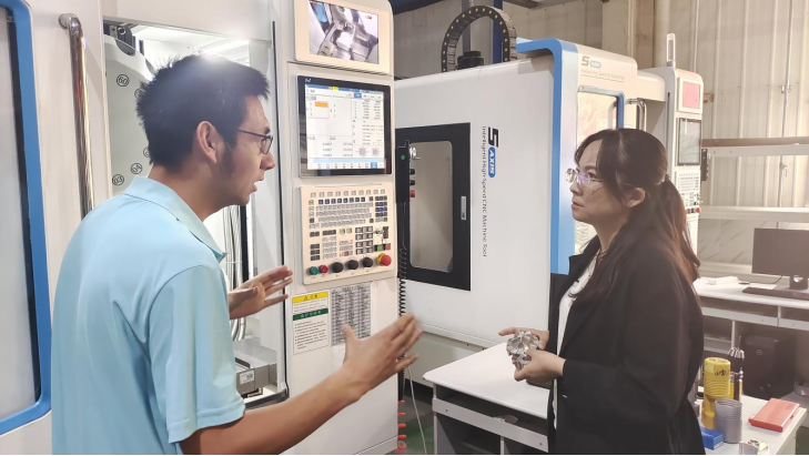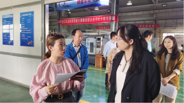 在1+X數(shù)控多軸加工中心侯蓉副院長與專業(yè)教師交流虛擬仿真教學與實訓融合應(yīng)用情況