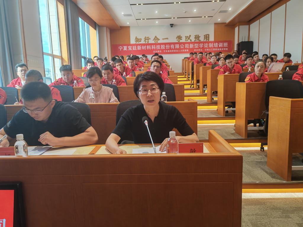隨后,學(xué)院副院長(zhǎng)王敏代表學(xué)校發(fā)言。她指出,此次與寧夏寶廷新材料合作開(kāi)展新型學(xué)徒制是學(xué)院拓展培訓(xùn)市場(chǎng)、服務(wù)企業(yè)發(fā)展的關(guān)鍵舉措。王敏詳細(xì)介紹,學(xué)院將結(jié)合企業(yè)生產(chǎn)需求與學(xué)徒崗位特點(diǎn),由新材料產(chǎn)業(yè)學(xué)院組建專(zhuān)業(yè)教學(xué)團(tuán)隊(duì),定制“理論+實(shí)操”培訓(xùn)方案——理論課程聚焦崗位核心知識(shí),實(shí)操訓(xùn)練依托企業(yè)生產(chǎn)場(chǎng)景開(kāi)展,確保學(xué)徒既能夯實(shí)專(zhuān)業(yè)基礎(chǔ),又能快速適應(yīng)崗位需求。同時(shí),她透露,學(xué)院正計(jì)劃進(jìn)一步擴(kuò)大培訓(xùn)市場(chǎng)覆蓋范圍,未來(lái)將針對(duì)寧東基地新材料產(chǎn)業(yè)集群,推出涵蓋技術(shù)升級(jí)培訓(xùn)、技能等級(jí)認(rèn)定、安全生產(chǎn)培訓(xùn)等多個(gè)領(lǐng)域,全方位滿(mǎn)足企業(yè)多元化培訓(xùn)需求。此外,她鼓勵(lì)全體學(xué)徒珍惜學(xué)習(xí)機(jī)會(huì),將課堂知識(shí)與生產(chǎn)實(shí)踐緊密結(jié)合,成長(zhǎng)為企業(yè)發(fā)展急需的技能骨干,實(shí)現(xiàn)個(gè)人價(jià)值與企業(yè)發(fā)展的雙向共贏。