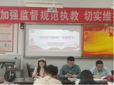 為深入學(xué)習(xí)貫徹習(xí)近平總書記關(guān)于黨的建設(shè)的重要思想,推動(dòng)黨紀(jì)學(xué)習(xí)教育走深走實(shí),引導(dǎo)全室黨員干部認(rèn)真學(xué)習(xí)《中國共產(chǎn)黨紀(jì)律處分條例》,努力做到學(xué)紀(jì)、知紀(jì)、明紀(jì)、守紀(jì)。5月22日,石嘴山工貿(mào)職業(yè)技術(shù)學(xué)院機(jī)械工程系黨支部開展“警鐘長(zhǎng)鳴知敬畏,清正廉潔葆本色”主題黨日活動(dòng),著力把黨紀(jì)學(xué)習(xí)教育融入日常、抓在經(jīng)常,真正使學(xué)習(xí)的過程成為增強(qiáng)紀(jì)律意識(shí)、提高黨性修養(yǎng)的過程。