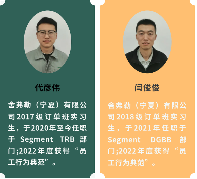 代彥偉是17級機電技術應用(舍佛勒)班學生,閆俊俊是18級電氣自動化專業(yè)學生。他們分別任職于舍弗勒(寧夏)有限公司SegmentTRB和SegmentDGBB部門,在工作中他們將學校學到的理論知識與實踐技能充分融合,勇于挑戰(zhàn)、敢于嘗試,并快速成長。在面對產(chǎn)線生產(chǎn)任務的壓力時,他們經(jīng)過不斷學習和不懈的努力,最終能夠獨當一面,成為企業(yè)的行家里手。