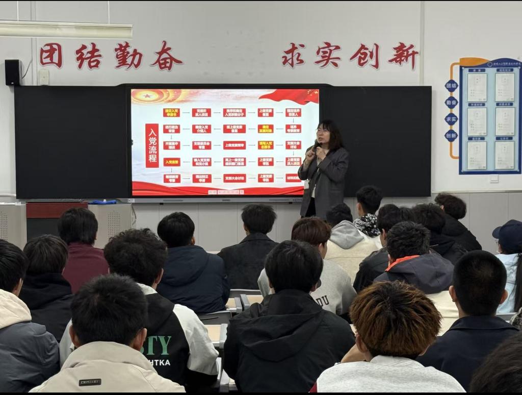 在黨員發(fā)展流程講解環(huán)節(jié),賈曉春以清晰的時(shí)間軸,將黨員發(fā)展全過(guò)程劃分為申請(qǐng)入黨、入黨積極分子確定與培養(yǎng)教育、發(fā)展對(duì)象確定與考察、預(yù)備黨員接收、預(yù)備黨員教育考察與轉(zhuǎn)正五大階段,結(jié)合具象化流程示意圖,逐環(huán)節(jié)明確各階段責(zé)任主體、時(shí)間節(jié)點(diǎn)與核心要求,讓同學(xué)們對(duì)入黨全流程形成系統(tǒng)、清晰的認(rèn)知。