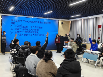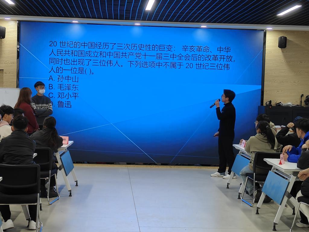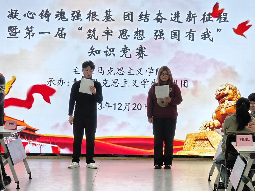 為深入學(xué)習(xí)貫徹落實(shí)習(xí)近平新時(shí)代中國(guó)特色社會(huì)主義思想,把黨的二十大精神、愛(ài)國(guó)主義教育等內(nèi)容融入教學(xué),以思想政治理論課教學(xué)與實(shí)踐活動(dòng)相結(jié)合,通過(guò)開(kāi)展豐富的校園文 化生活,進(jìn)一步營(yíng)造濃厚學(xué)習(xí)氛圍,推動(dòng)學(xué)院“五育并舉”“三 全育人”“三進(jìn)”工作走深走實(shí),引導(dǎo)廣大學(xué)子增強(qiáng)文化自覺(jué), 堅(jiān)定文化自信,激發(fā)大學(xué)生的愛(ài)國(guó)情、強(qiáng)國(guó)志,馬克思主義學(xué)院特舉辦凝心鑄魂強(qiáng)根基團(tuán)結(jié)奮進(jìn)新征程暨第一屆“筑牢思想、強(qiáng)國(guó)有我”知識(shí)比賽活動(dòng)。馬克思主義學(xué)院教師指導(dǎo)青年馬克思主義宣講社團(tuán)于12月20日在11號(hào)樓116教室舉辦“筑牢思想、強(qiáng)國(guó)有我”知識(shí)比賽。