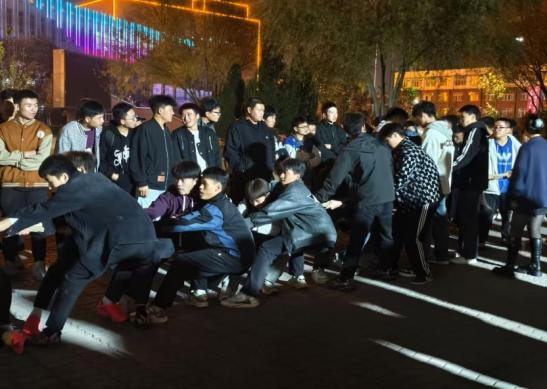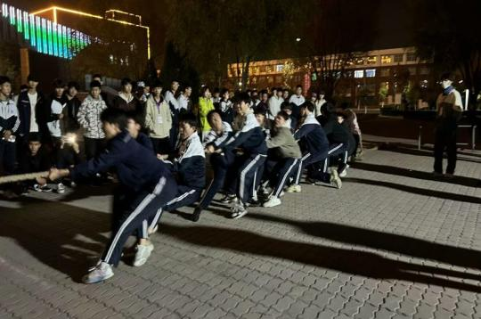 預(yù)賽和決賽現(xiàn)場,雖然深秋寒風(fēng)習(xí)習(xí),但也抵擋不住同學(xué)們的對比賽的熱情。微弱的燈光下看到運(yùn)動員們?nèi)σ愿暗纳碛?。隨著開賽的哨聲響起,所有的隊(duì)員鉚足了勁,雙腳死死蹬住地面,緊握粗繩,不放過任何取得成功的機(jī)會,同學(xué)們的吶喊聲也堅(jiān)定了他們?nèi)〉帽貏俚臎Q心。在繩索超過界線之后,獲勝的隊(duì)伍歡呼雀躍,雙手高舉,感慨這來之不易的勝利!