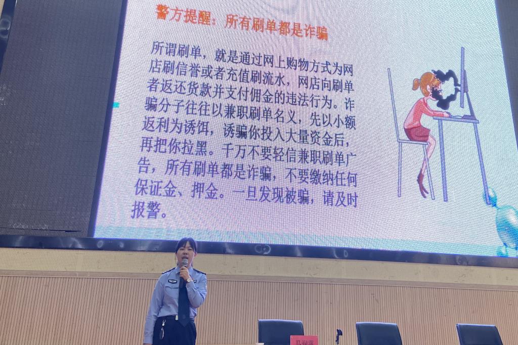 隆湖派出所干警馬潤(rùn)露結(jié)合多年工作經(jīng)驗(yàn),用近些年的典型詐騙案例向同學(xué)們闡述了什么是電信網(wǎng)絡(luò)詐騙、電信網(wǎng)絡(luò)詐騙的特點(diǎn)以及多種防范電信網(wǎng)絡(luò)詐騙的措施。重點(diǎn)從網(wǎng)絡(luò)刷單、網(wǎng)絡(luò)點(diǎn)贊、網(wǎng)絡(luò)游戲充值等方面揭露騙子的伎倆和手段,倡導(dǎo)廣大師生及時(shí)安裝利用好國(guó)家反詐APP,提高警惕防范一切網(wǎng)絡(luò)電信詐騙。此外,在大會(huì)過(guò)程中隆湖所的干警同志們通過(guò)發(fā)傳單的方式進(jìn)一步向師生宣傳如何防范電信網(wǎng)絡(luò)詐騙。最后,學(xué)院副院長(zhǎng)鄒韌呼吁廣大師生要積極增強(qiáng)個(gè)人保護(hù)意識(shí),不再使用的銀行卡和電話卡,及時(shí)進(jìn)行注銷。發(fā)現(xiàn)有收售銀行卡和電話卡的人員,及時(shí)向?qū)W院安全保衛(wèi)處或公安機(jī)關(guān)進(jìn)行舉報(bào)。希望全院師生緊繃防范之弦,遠(yuǎn)離詐騙之害。