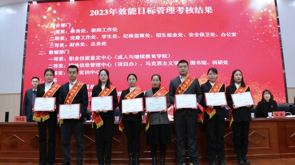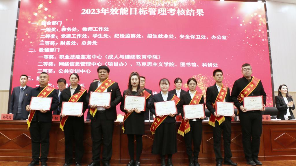 大會(huì)上,通報(bào)了2023年效能目標(biāo)管理考核結(jié)果,表彰了2023年年度考核優(yōu)秀等次人員、2023年度招生就業(yè)工作先進(jìn)個(gè)人、就業(yè)工作先進(jìn)集體。機(jī)械工程系副主任蘭晏文、電氣工程系副主任劉博雅、商貿(mào)管理系教師宋仁娟、商貿(mào)管理系教師王曉紅分別圍繞工作實(shí)際,總結(jié)2023年日常工作、招生就業(yè)工作經(jīng)驗(yàn),做了交流發(fā)言。