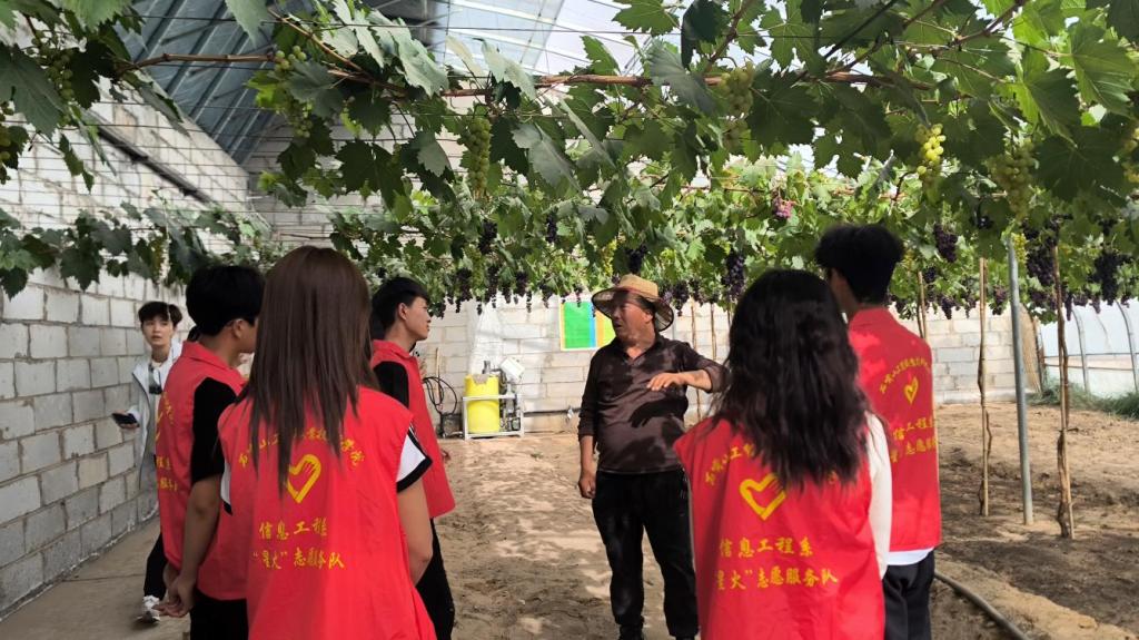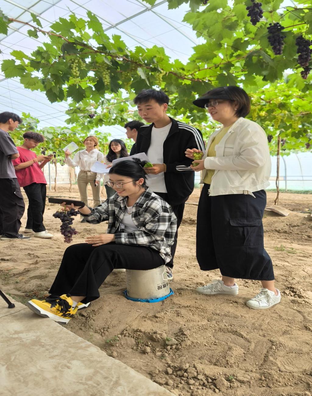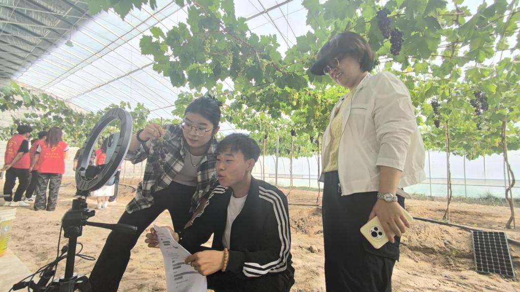 活動(dòng)當(dāng)天,志愿者們先后參觀了祥河幸福采摘園、華潤菌菇種植園區(qū)及高標(biāo)準(zhǔn)農(nóng)田等現(xiàn)代農(nóng)業(yè)示范點(diǎn)。在采摘園內(nèi),陽光玫瑰、黑美人、玉波二號(hào)等葡萄品種掛滿枝頭,小蘭西瓜也長勢喜人,學(xué)生們?cè)谵r(nóng)業(yè)技術(shù)員的講解下,聆聽了果蔬的科學(xué)管理方法。在華潤菌菇種植園區(qū),七河三號(hào)與七河九號(hào)香菇品種吸引了大家的目光,技術(shù)員詳細(xì)講解了食用菌的培育技術(shù)和生長環(huán)境要求。觀摩結(jié)束后,電子商務(wù)專業(yè)教師孫夢穎帶領(lǐng)電商專業(yè)學(xué)生化身“帶貨主播”,開展直播助農(nóng)實(shí)踐。通過直播平臺(tái),電商師生不僅展示了祥河村的優(yōu)質(zhì)農(nóng)產(chǎn)品,還宣傳了現(xiàn)代農(nóng)業(yè)科技與生態(tài)理念。