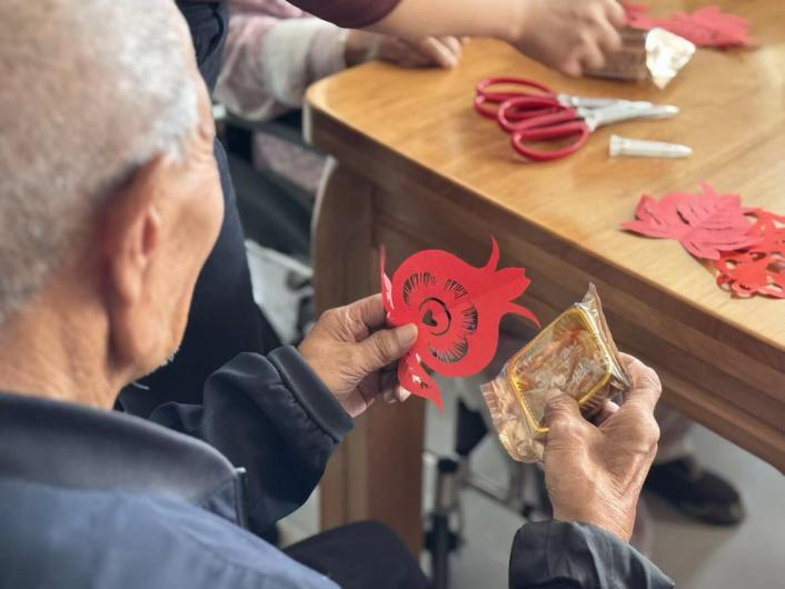活動(dòng)的另一大亮點(diǎn)是學(xué)院龔麗娟老師帶去的剪紙互動(dòng)環(huán)節(jié)。龔老師攜手志愿者們現(xiàn)場教學(xué),與托養(yǎng)服務(wù)中心的殘疾人及老人們一同剪制象征團(tuán)結(jié)、和諧、多子多福的石榴圖案,一張張紅紙?jiān)谑种蟹D(zhuǎn)、裁剪,不一會(huì)兒,一幅幅生動(dòng)精美的石榴剪紙作品便呈現(xiàn)出來。剪紙活動(dòng)不僅讓大家體驗(yàn)了中華傳統(tǒng)文化的魅力,更通過石榴的美好寓意,寄托了對(duì)民族團(tuán)結(jié)、社會(huì)和諧以及生活美滿的誠摯祝福。