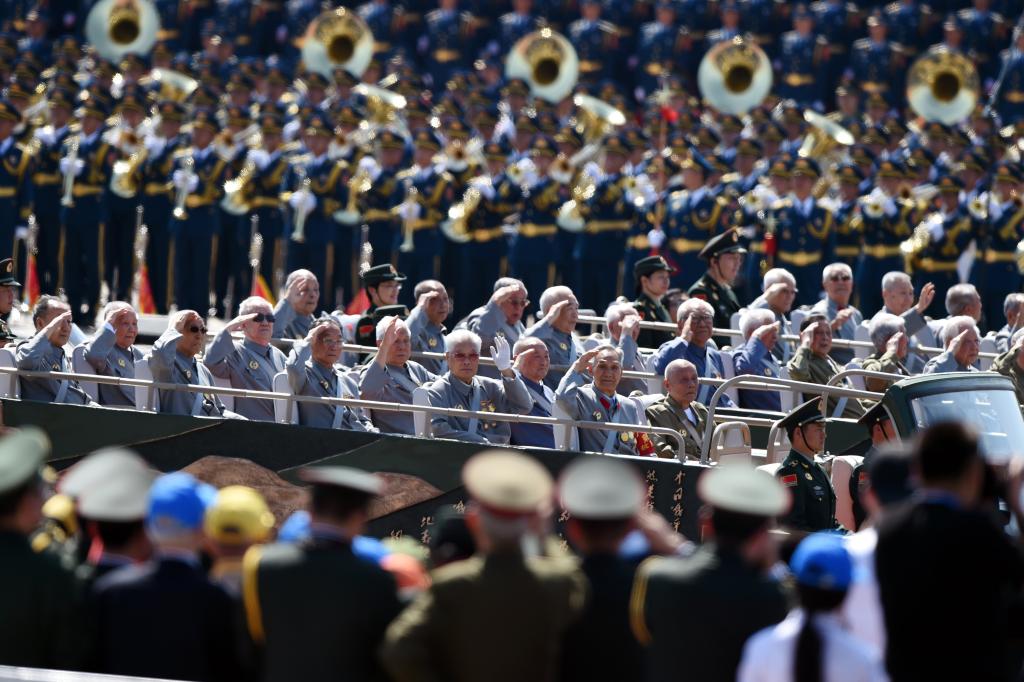 2015年9月3日,中國人民抗日戰(zhàn)爭暨世界反法西斯戰(zhàn)爭勝利70周年紀念大會在北京隆重舉行。這是抗戰(zhàn)老兵乘車方隊通過天安門廣場。