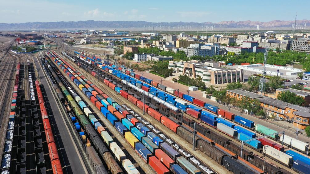 2024年5月25日,在新疆阿拉山口站寬準軌編組場,出入境中歐班列集結(jié)等待出發(fā)(無人機照片)。