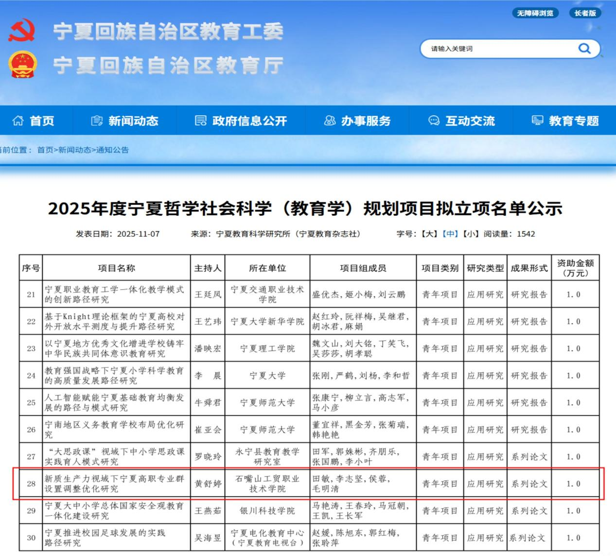 ? 近日,寧夏教育科學(xué)研究所(寧夏教育雜志社)公示了2025年度寧夏哲學(xué)社會科學(xué)(教育學(xué))規(guī)劃項目擬立項名單,石嘴山工貿(mào)職業(yè)技術(shù)...