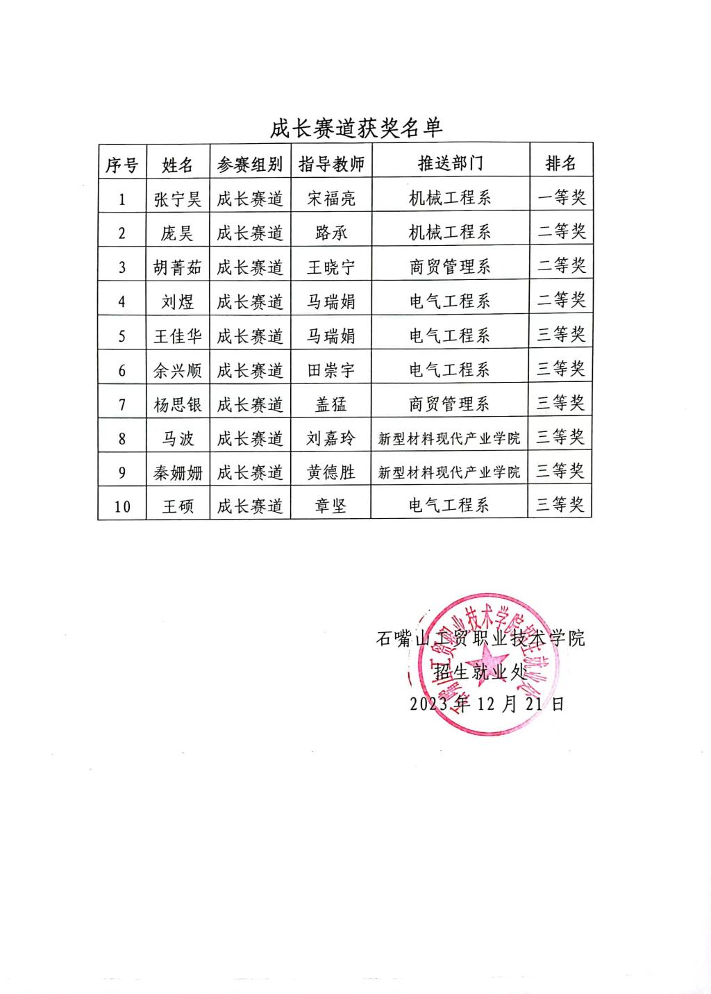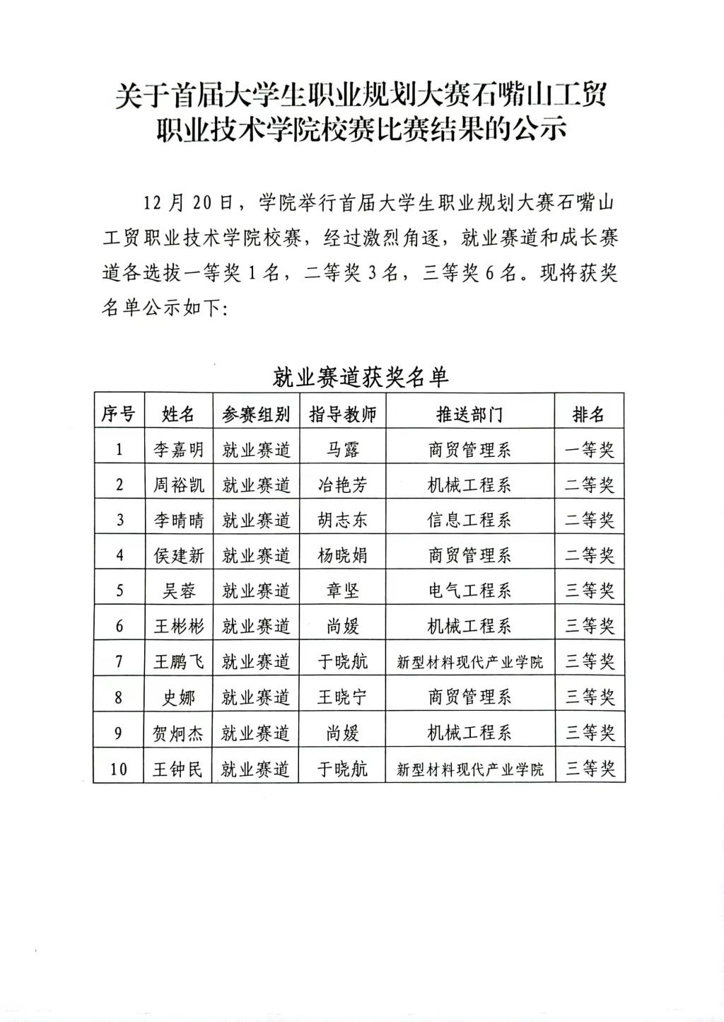 關于首屆大學生職業(yè)規(guī)劃大賽石嘴山工貿(mào)職業(yè)技術學院校賽比賽結果的公示