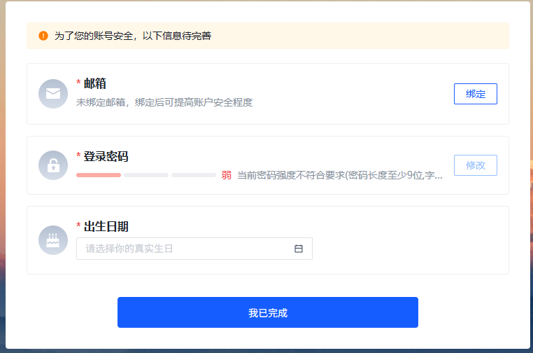 按照網(wǎng)絡信息安全相關要求,請各位考生按照要求綁定電子郵箱、修改密碼、出生日期。